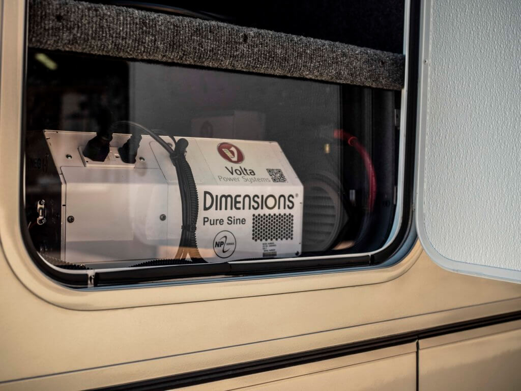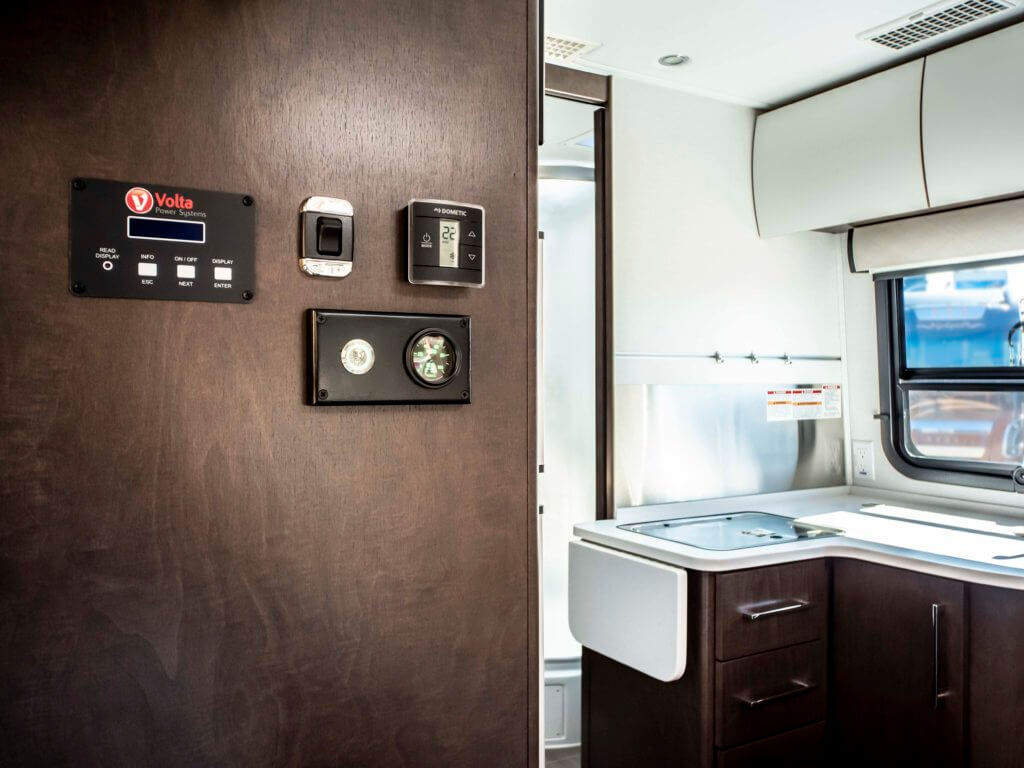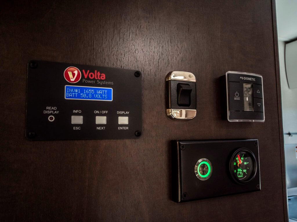 Each Volta retrofit project also includes our custom made State of Charge (SOC) gauge, an easy-to-use on and off switch and an inverter display. Each component was installed with a factory-installed look by Holland Motor Homes.