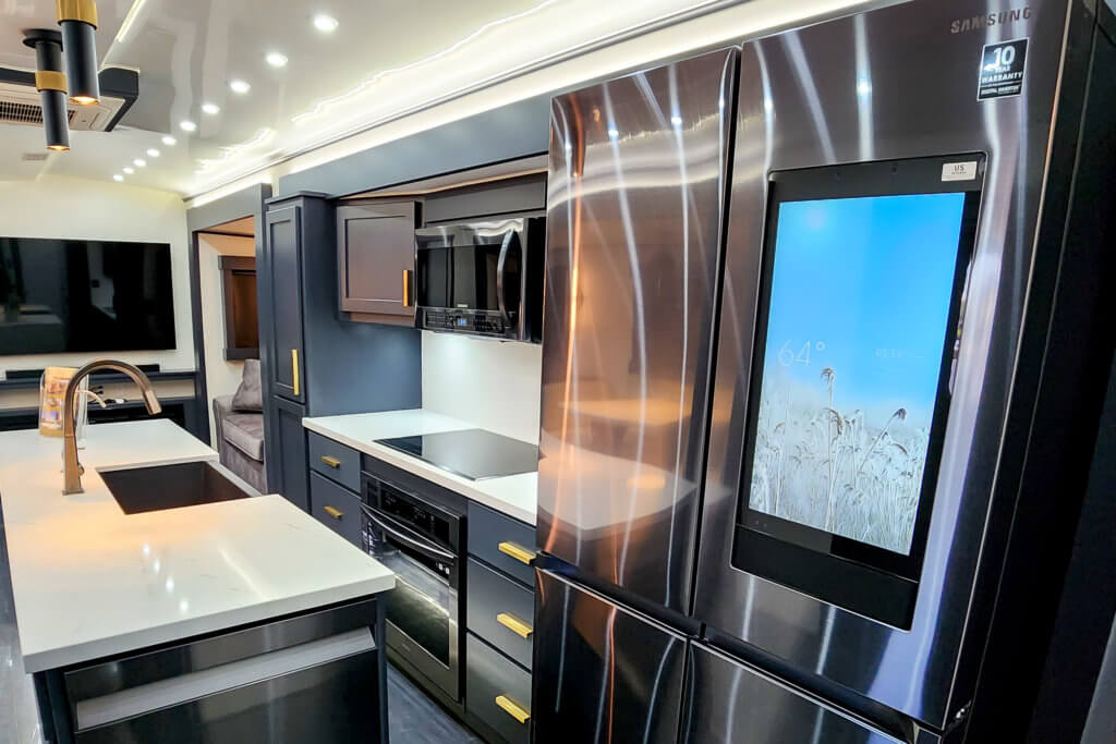 Enhancing the at-home, high-comfort feel, the vehicle will contain residential appliances, heated tile floors, a 50” fireplace, tankless hot water, and Starlink internet.