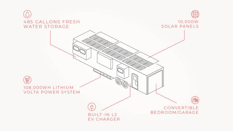 The extended stay RV can keep you comfortable off-grid for weeks, transport an electric SUV and charge it too with over 100 kilowatt hours of li-ion storage on-board.