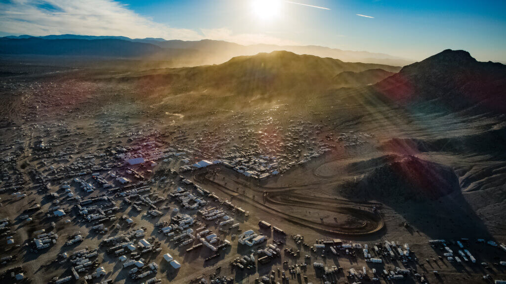 The 2023 Progressive King of the Hammers takes place in Johnson Valley, a dry lakebed in southern California. The event will draw out over 50,000 off-road racers and fans to Hammertown, a temporary city, for over two weeks of racing, camping, music, food and off-road innovation. It is similar to Burning Man in scope.