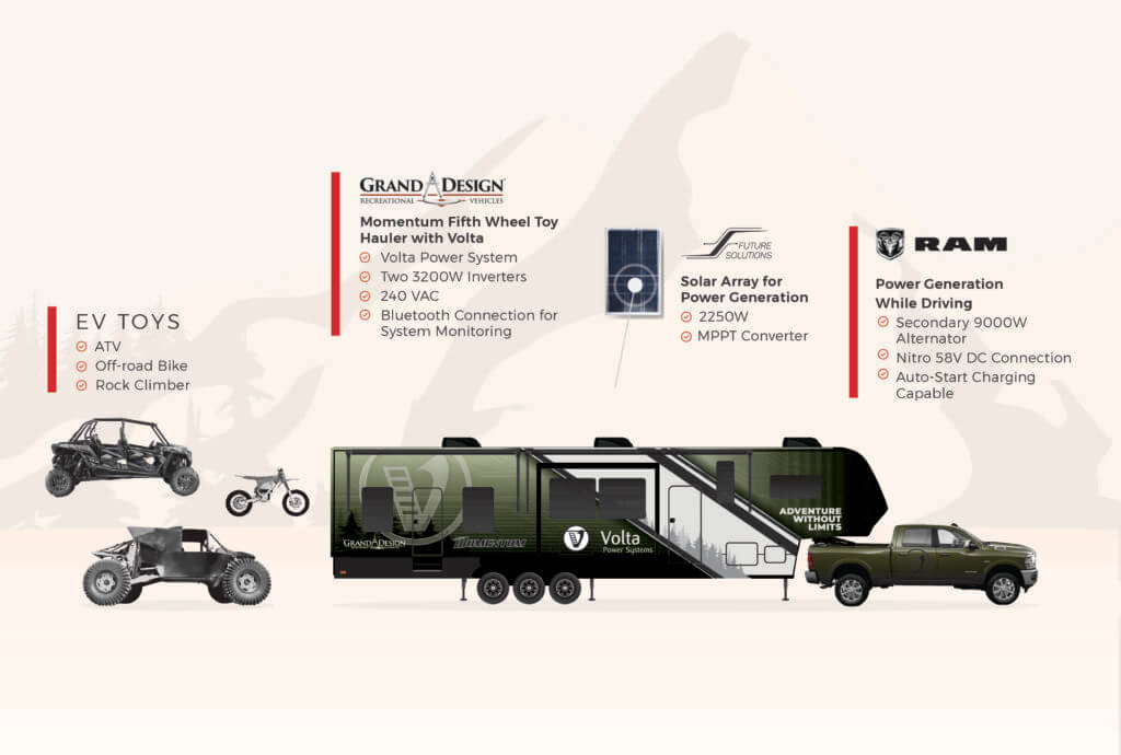 Volta will be showing a 42’ Grand Design 5th Wheel Toy Hauler with a 36kWh li-ion system, 2,250W of solar, and an exportable EV charger for EV toys. The trailer itself can be recharged from shore, solar, or from a specialty-upfitted Dodge RAM with a secondary alternator.