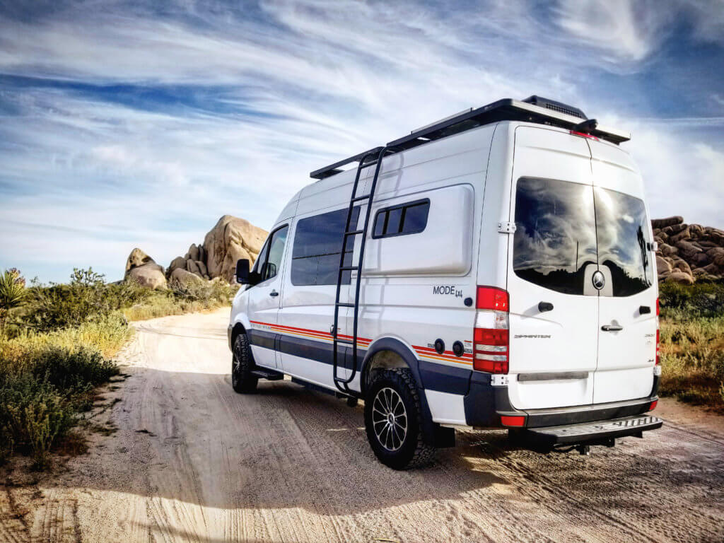 The “M-Power” system, powered by Volta, on the current generation of the MODE™4×4 adventure-ready van series delivers 12kwh of storage and up to 3.6kW of AC power, that can be continuously charged from a second alternator while driving; by the 100W of onboard solar panels (expandable up to 800+ watts); or by a built in 30amp “shore power” connection (when conventional power sources are available).