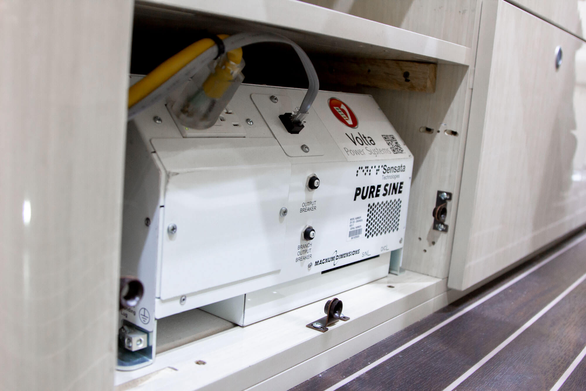 Our system also included a Volta 3600W pure sine inverter that’s discreetly hidden under the sink in the RV. To make it fit, Scott and his team modified the existing cabinetry to provide a factory-fitted appearance. This unit provides a 30amp 120V service which makes the customer feel plugged into shore power at all times.