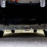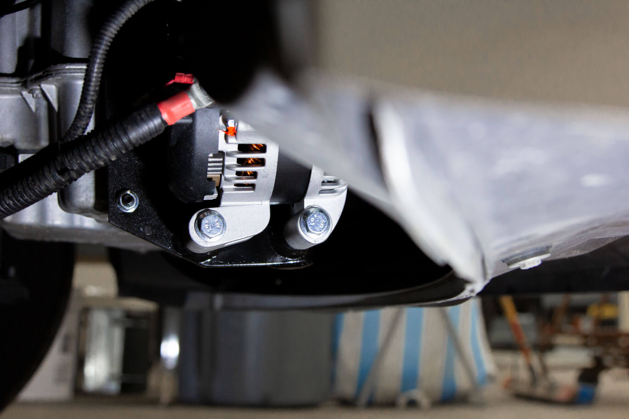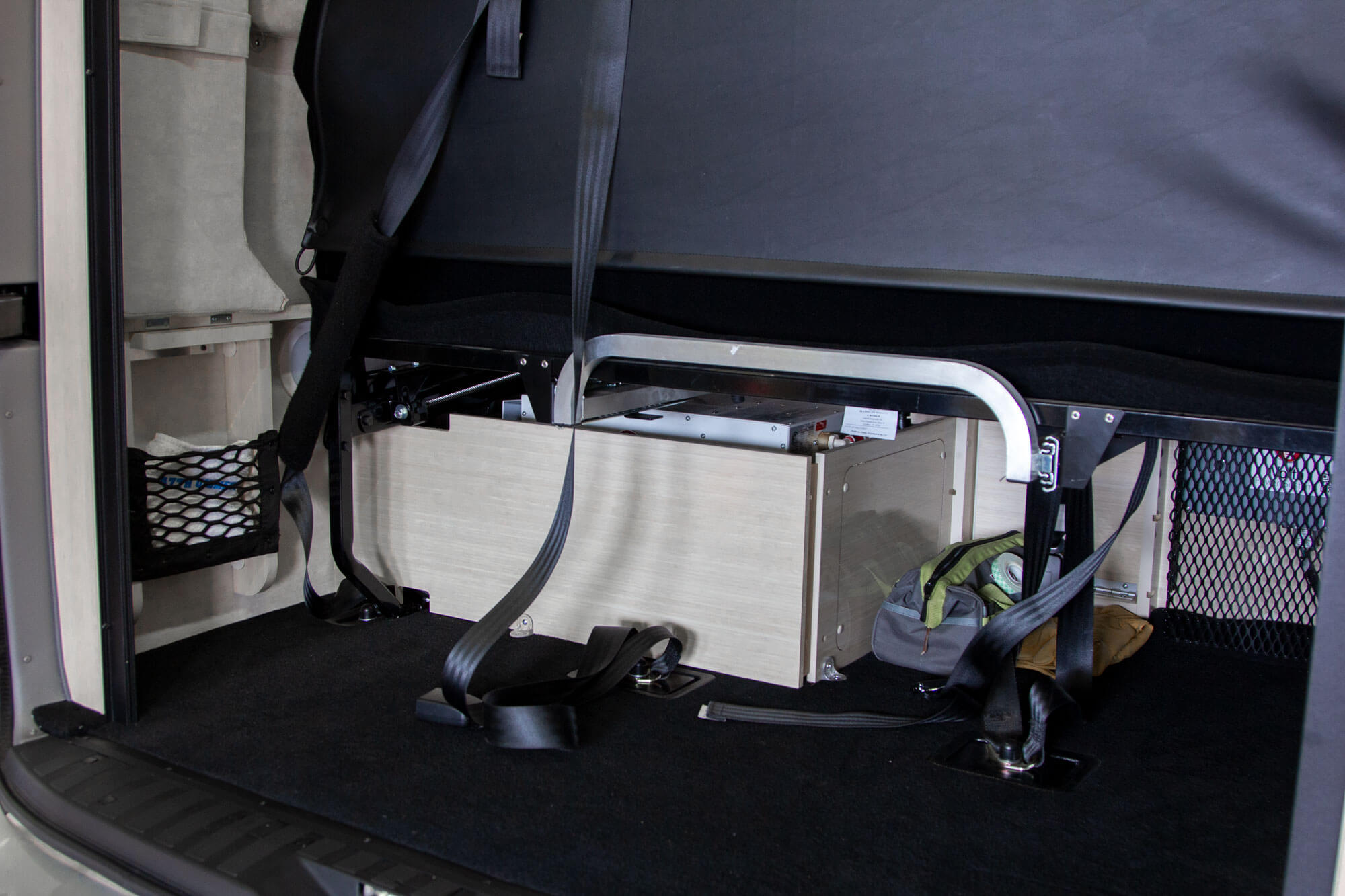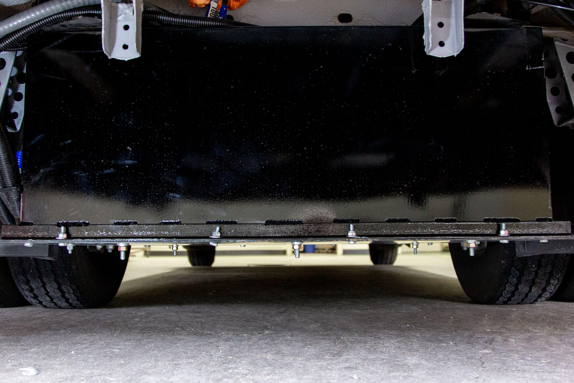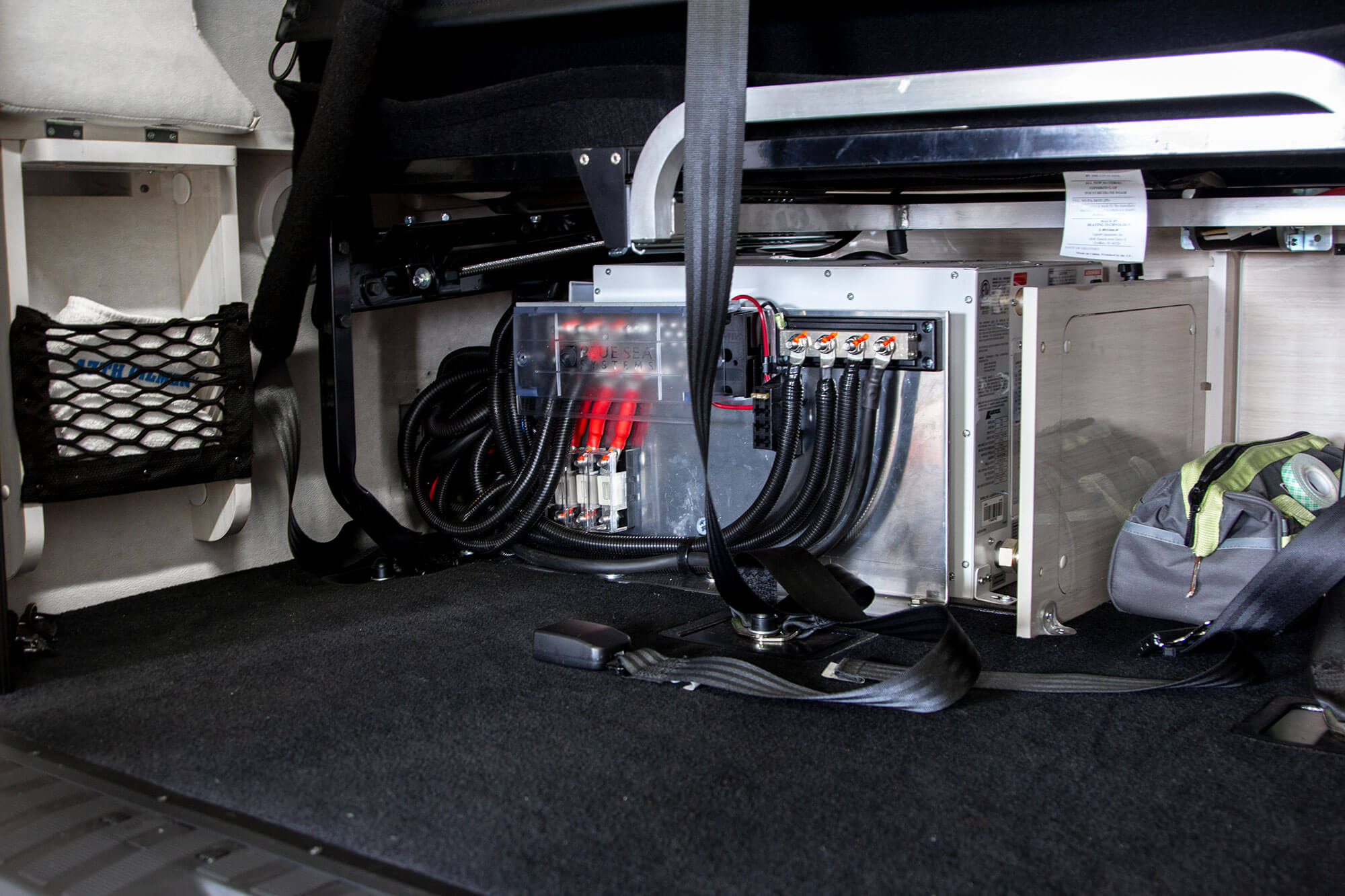 The Onan generator was replaced with a 12kWh pack mounted in the same place as the generator. Despite the change, we used the original generator brackets and enclosed the pack with insulation and protection, all while maintaining the same ground clearance as with the original generator.