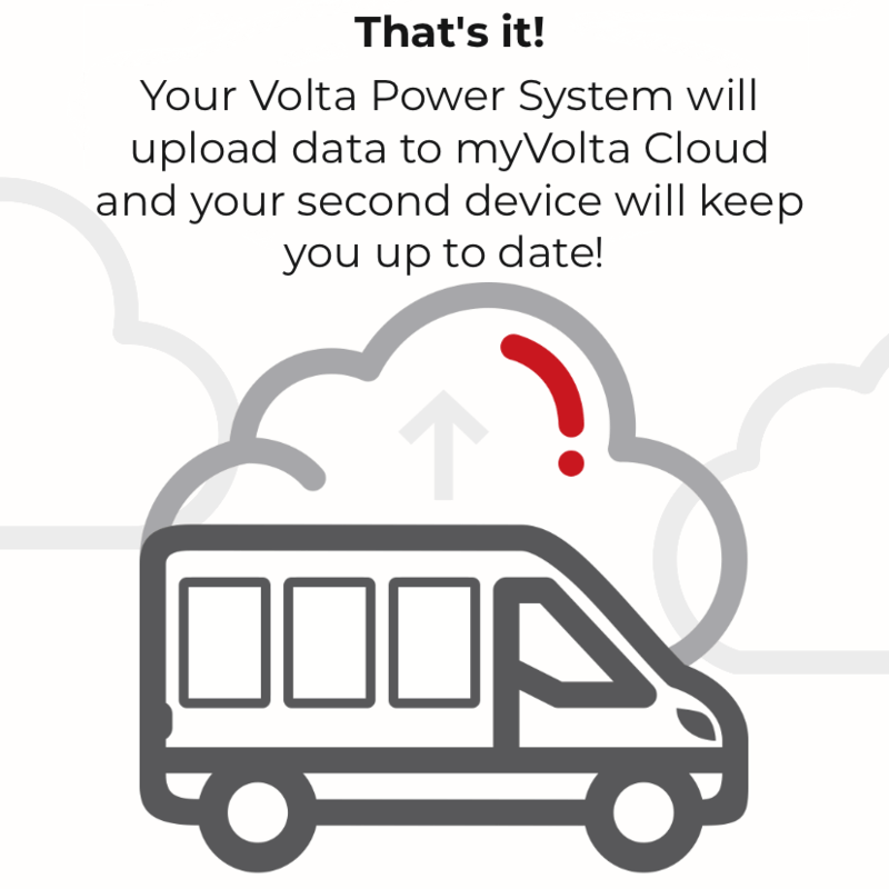 - Two devices must have the myVolta app downloaded, be signed into the same Volta account and have consistent internet access through data, campground WIFI, an in-van router, etc.